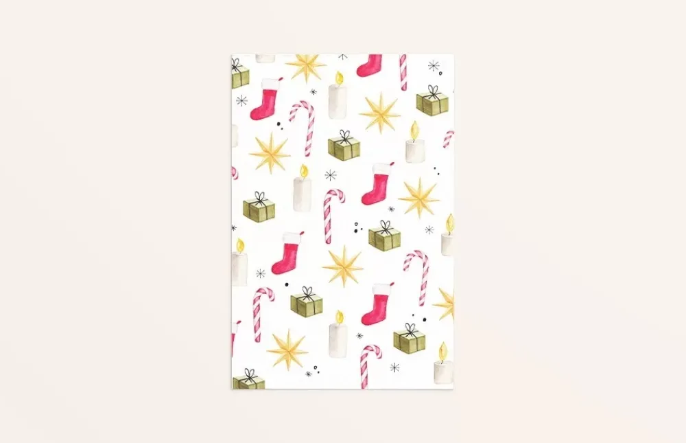 Kaart met print van kerstcadeaus, geschilderd met waterverf. De Kerst wenskaart is perfect voor bij een cadeautje of om te versturen. De kaart is gedrukt op mooi stevig papier, dus je kan het ook neerzetten ter decoratie.