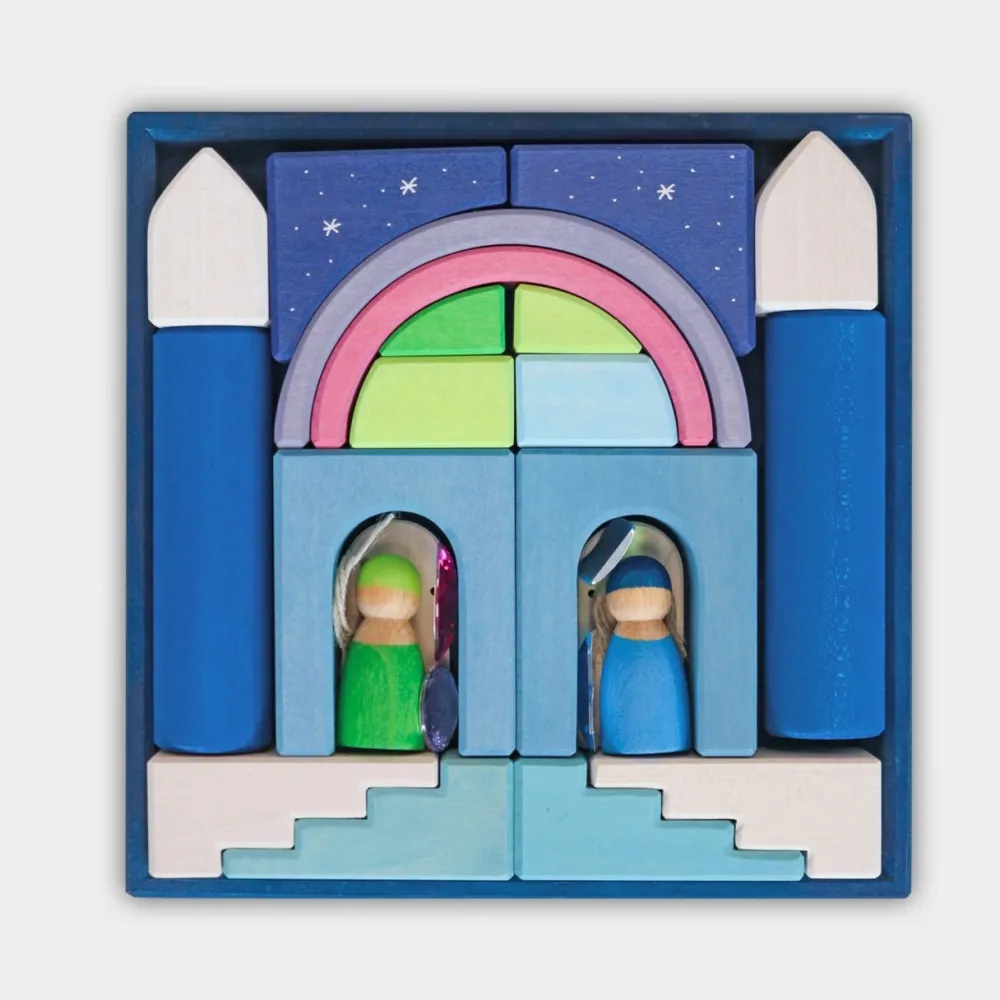 De blokkendoos Polar Light uit de Bouwwereld serie wordt geleverd in een handig houten frame. Met de praktische kleine bouwstenen kan een hele bijzondere speelwereld worden gemaakt. De set bevat o.a. glanzende edelstenen, een beweegbare deur en poppetjes.