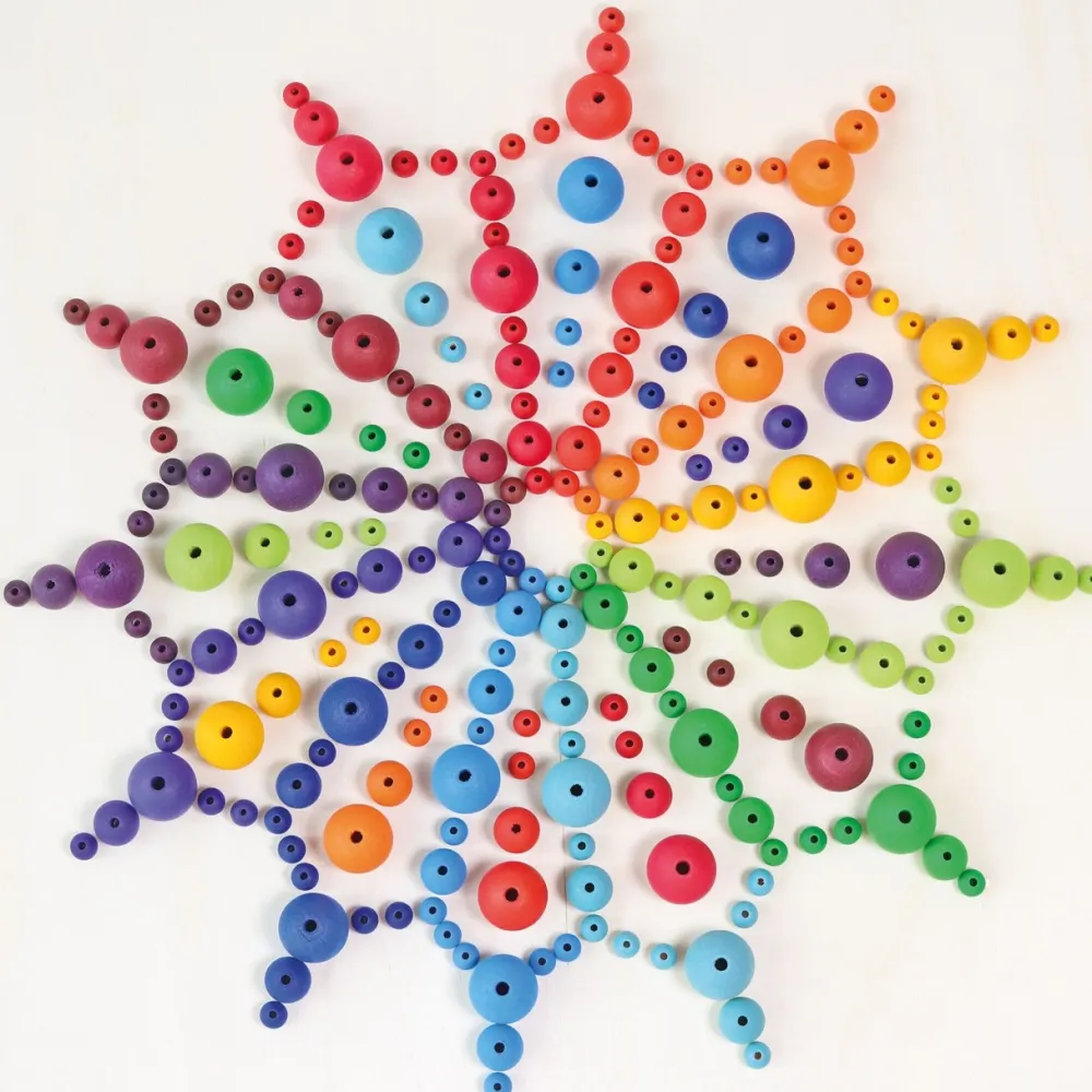 Deze set kralen van Grimm's bestaat uit 36 houten kralen in regenboogkleuren. De kralen zijn gemaakt van Esdoornhout en hebben een diameter van 3 cm.