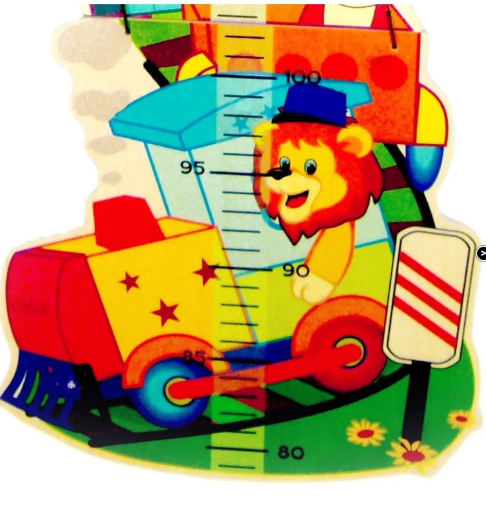 Kijken hoe groot je bent? Dan kan gemakkelijk met deze groeimeter. Een echte groeimeter voor de treinenliefhebber. Een leeuw bestuurt in de lokomotief de trein, in elk wagonnetje erachter zit een dier zoals een olifant, een vos en nog meer.