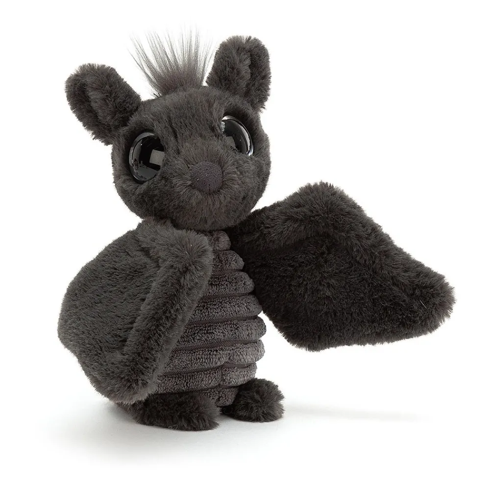 Dit is Frizzles bat van Jellycat. Deze vleermuis is heel schattig met zijn grote glinsterende ogen, grappige kuifje, zacht cordu roy buik en fluweelzachte vleugels. Hoogte: 18 cm.