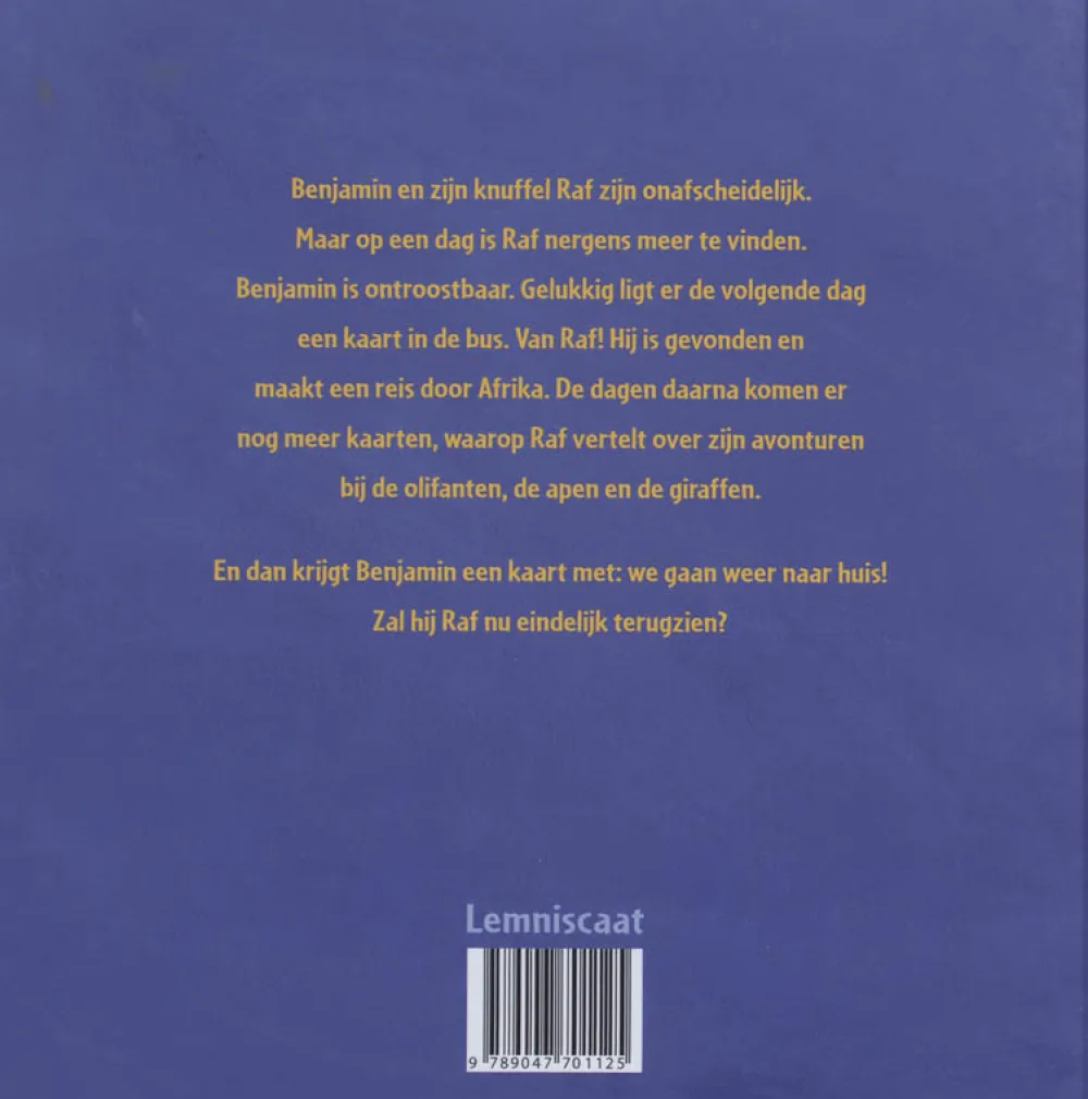 Benjamin en zijn knuffel Raf zijn onafscheidelijk. Maar op een dag is Raf nergens meer te vinden. Benjamin is ontroostbaar. Gelukkig ligt er de volgende dag een kaart in de bus. Van Raf!
