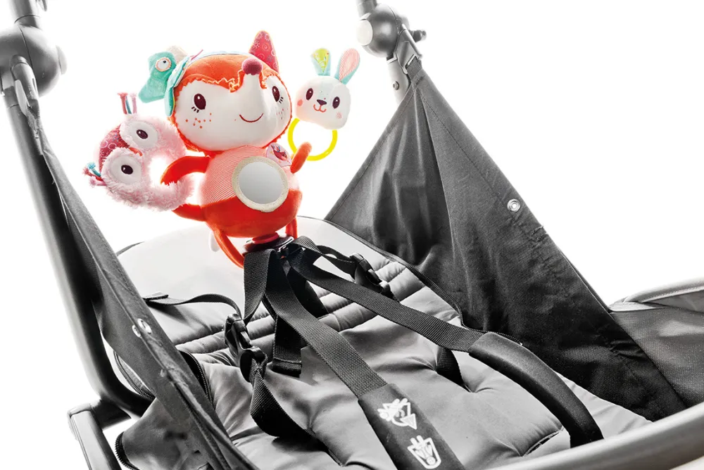 Alice gaat graag mee met jou wandelen. Maak haar vast aan de riemen van de buggy of het kinderzitje en hou haar dicht bij jou. Ze zal je zintuigen prikkelen met al haar zachte en leuke activiteiten: een konijn met spiegeltje, een knuffeluiltje, een knispe