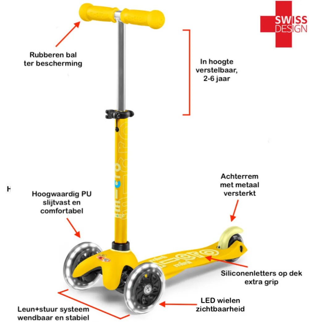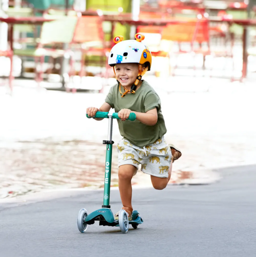 Deze mint groene Mini Micro Deluxe ECO is extra veilig door zijn witte LED lampjes, zodat je kind 's avonds beter zichtbaar is. Geen batterijen nodig, dus milieuvriendelijk. Kinderen vinden de lampjes natuurlijk vooral heel erg cool.