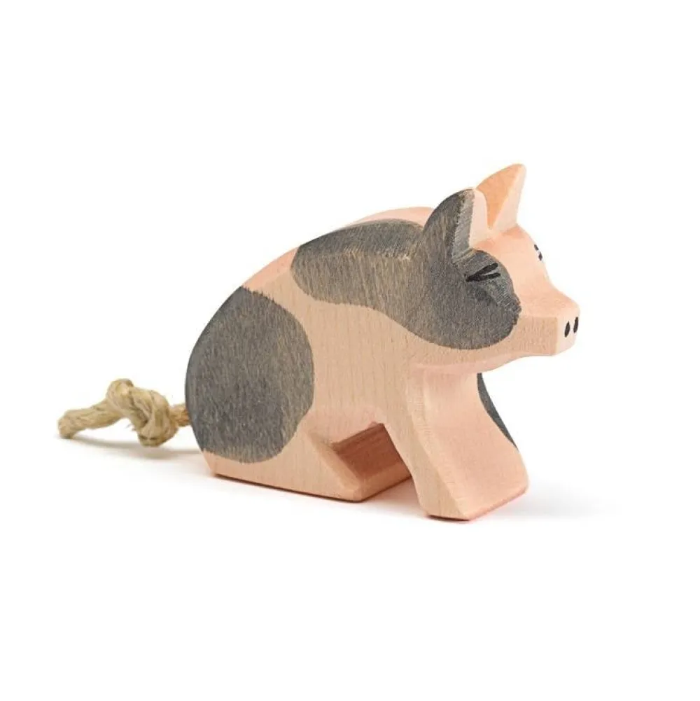 Deze met de hand, uit hout gesneden big van Ostheimer komt uit de serie boerderijdieren. Deze bigis lekker lui gaan zittenen is gevlekt. Hoogte: 4.5cm