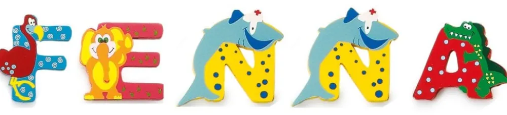 Letters van hout van het alfabet A t/m Z met een leuk dierenmotief. Geschikt voor aan de wand, op de deur in de kinderkamer of op een verjaardagsfeestje waar je de naam van het kind vrolijk neerlegt naast de verjaardagstaart!