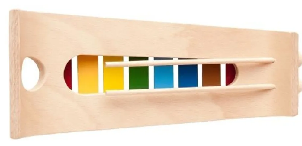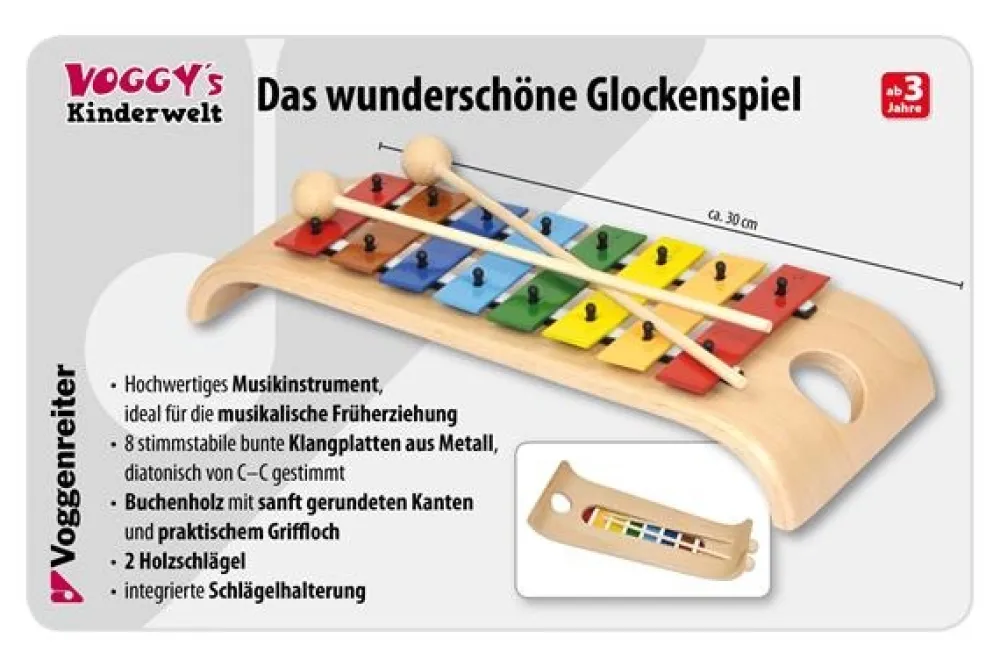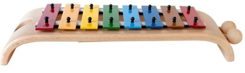 De gebogen klankbrug draagt 8 hoogwaardige kleurrijke metalen klankstaven. Zacht afgeronde randen en de wasbehandeling maken dit klokkenspel tot een echte "handvleier". De twee houten hamers kunnen gemakkelijk worden opgeborgen in de geïntegreerde houde