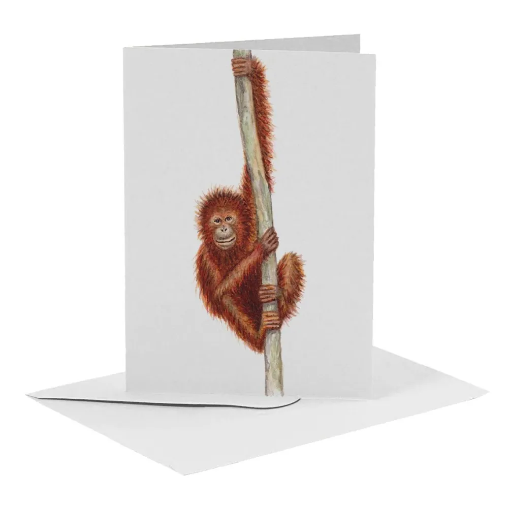 Een blanco wenskaart zonder tekst waarop een aap is afgebeeld. De schildering is gemaakt door Mies met aquarelverf. De kaart is gevouwen op A6 formaat, gedrukt op 350 grams gebroken wit papier en wordt inclusief witte envelop geleverd.