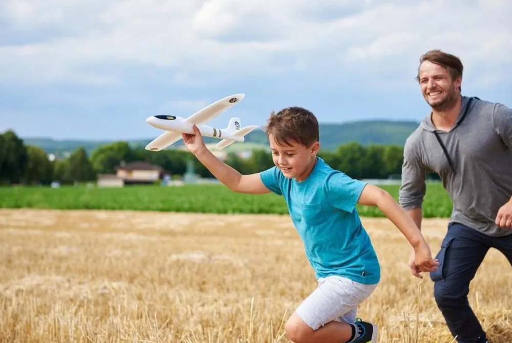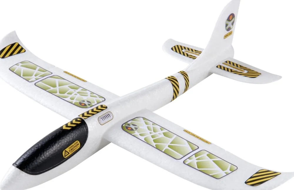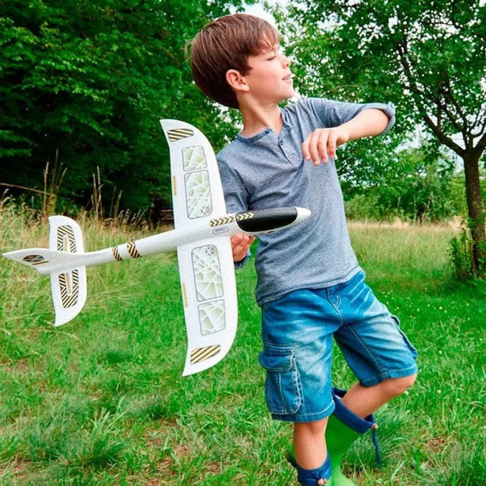 Speelplezier in een loop: neem het vliegtuig bij de romp onder de vleugels tussen de duim en de wijsvinger vast, lanceer het met een grote zwaai en laat het snel en sierlijk door de lucht zweven.