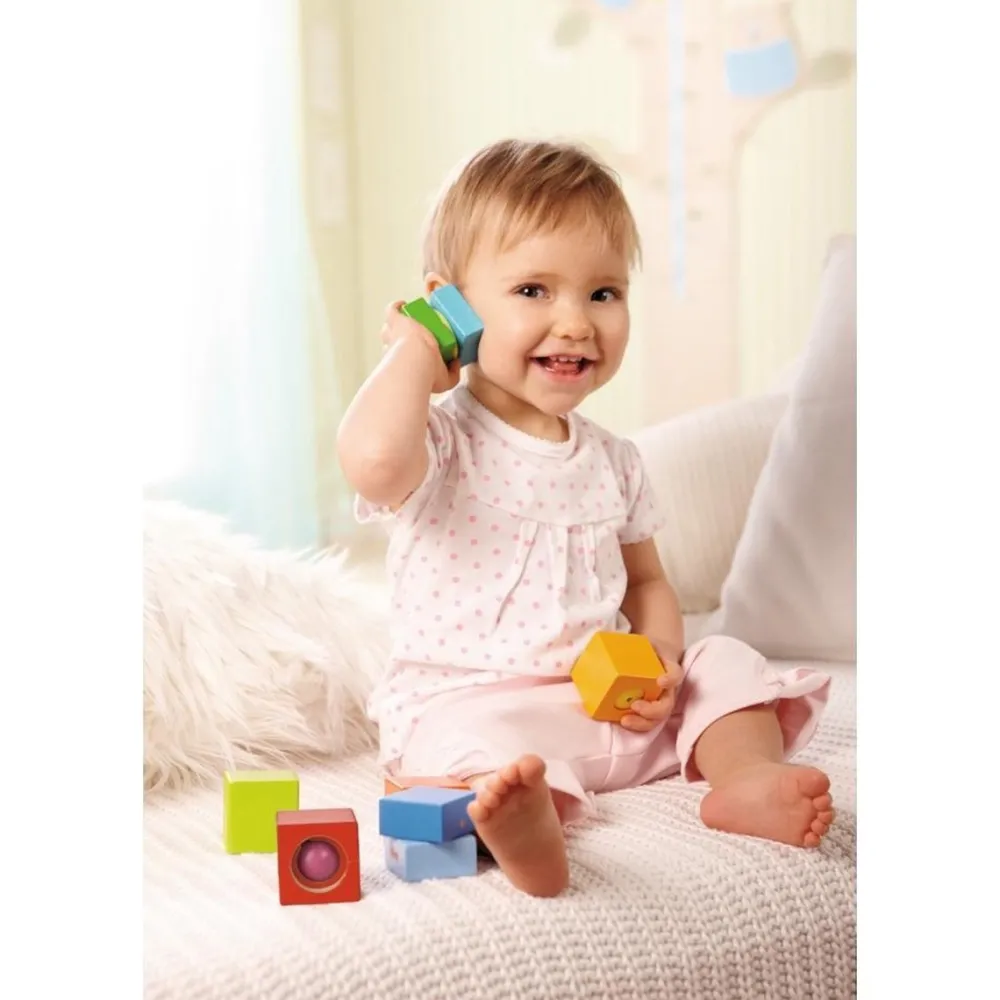 Spits je oren, want hier zijn heel veel verschillende geluiden te horen. Piepen, rammelen, bellen, ratelen… elk blok heeft een ander akoestisch effect in voorraad. Kleine klankenonderzoekers komen tijdens het spelen met de ontdekkingsstenen helemaal aan