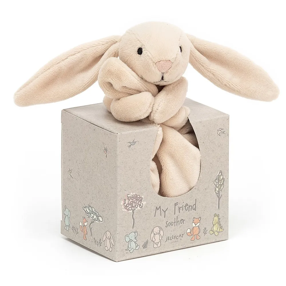 Open de mooie cadeaudoos en wie komt er tevoorschijn: my friend bunny soother van Jellycat. Dit konijn heeft lange oren en houdt de fluweelzachte knuffeldoek stevig vast. Doeklengte: 22 cm.