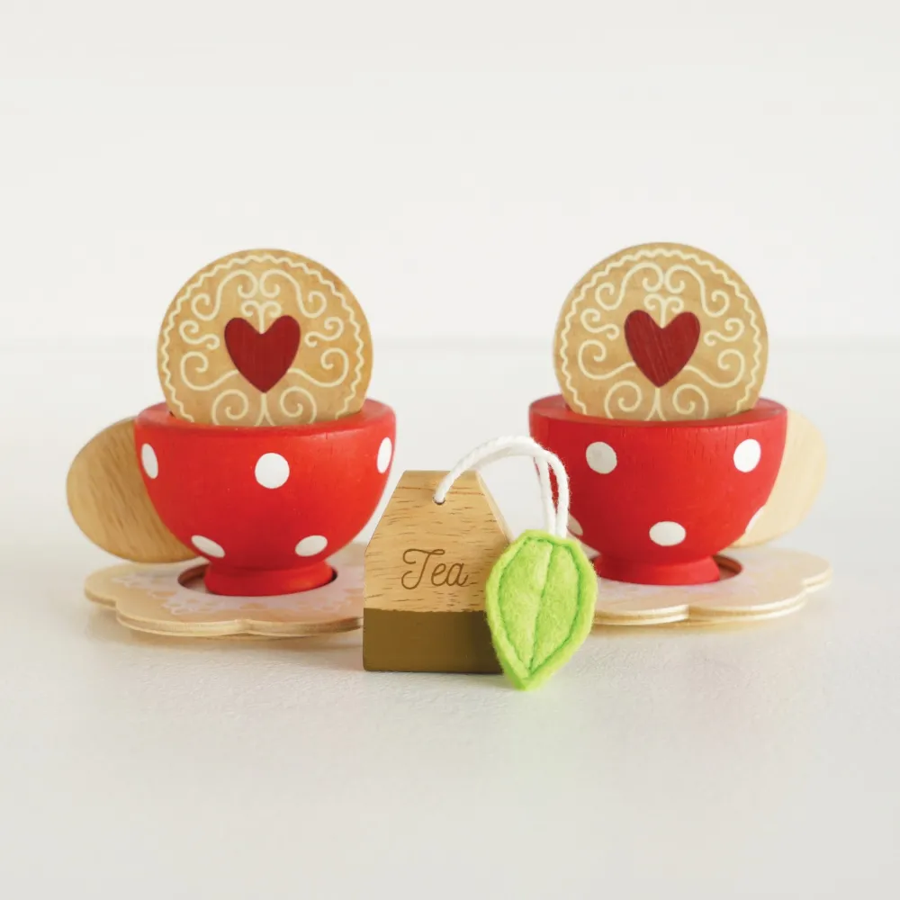 Dit houten theeservies van Le Toy Van bestaat uit een dienblad waarop de twee kopjes, de theepot, de suikerpot en het melkkannetje gezet kunnen worden.