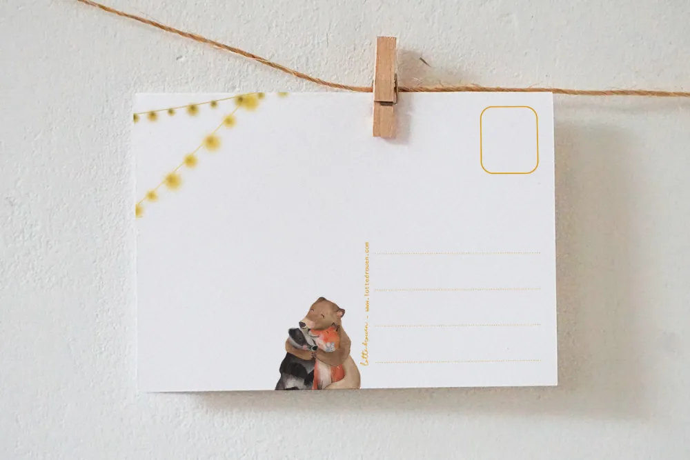 Betoverende kaart met bosdieren die lekker aan het knuffelen zijn. Een mooie orginele illustratie die verstuurd kan worden bij een feestelijke gelegenheid of bij een cadeau stoppen of als versiering aan de muur.
