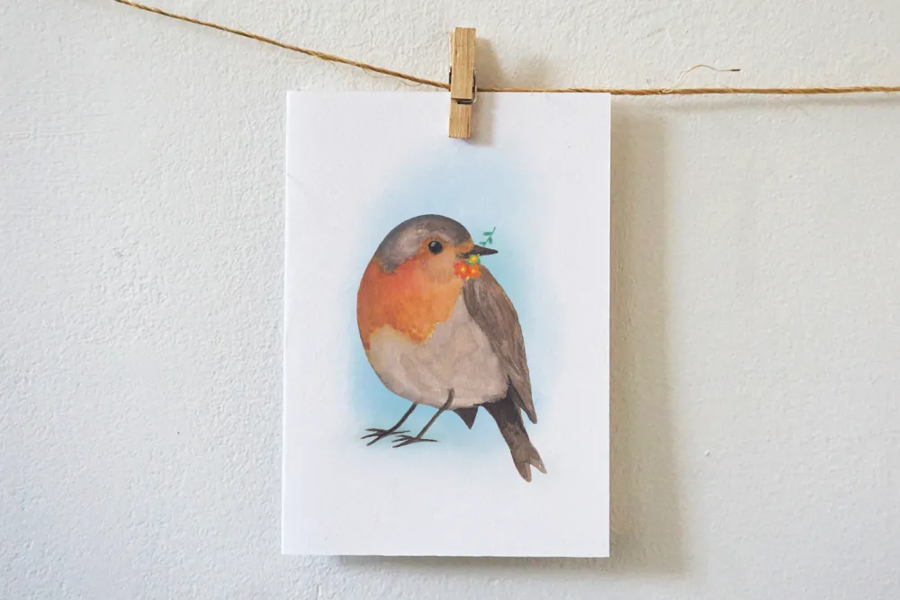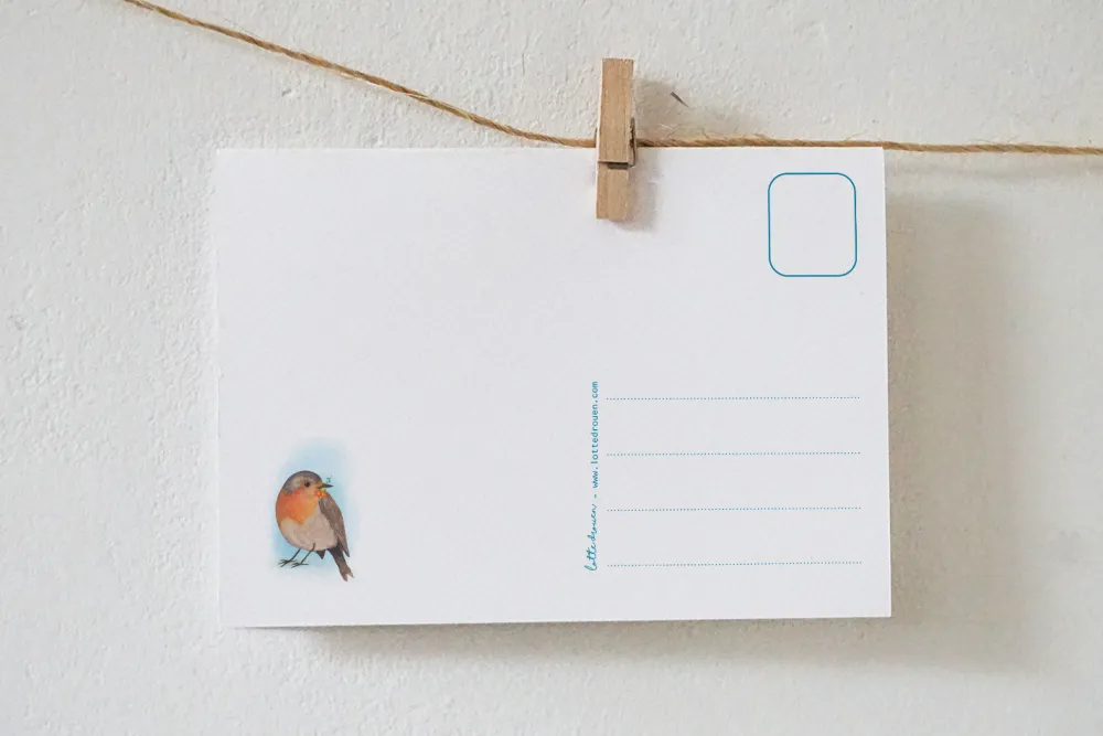 Lotte Drouen Wenskaarten^Ansichtkaart Roodborstje met bloemen