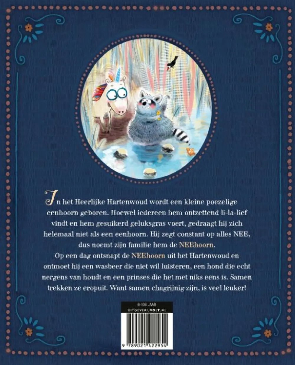 Hij zegt constant op alles NEE, dus noemt zijn familie hem de NEEhoorn. Op een dag ontsnapt de NEEhoorn uit het Hartenwoud en ontmoet hij een wasbeer die niet wil luisteren, een hond die echt nergens van houdt en een prinses die het met niks eens is. Samen trekken ze eropuit. Want samen chagrijnig zijn, is veel leuker!